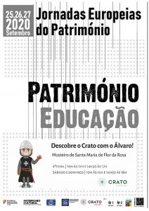 Jornadas Europeias do Património Atualizado em 06/08/2021 “Património – Educação” 25, 26 e 27 de setembro 2020 Mosteiro de Santa Maria de Flor da Rosa “Descobre o Crato com o Álvaro” 6ªfeira | 10h às 12h e das 14h30 às 17h Sábado e domingo | 10h às 12h e das 14h30 às 18h Anterior Notícia anterior Próximo Próxima notícia